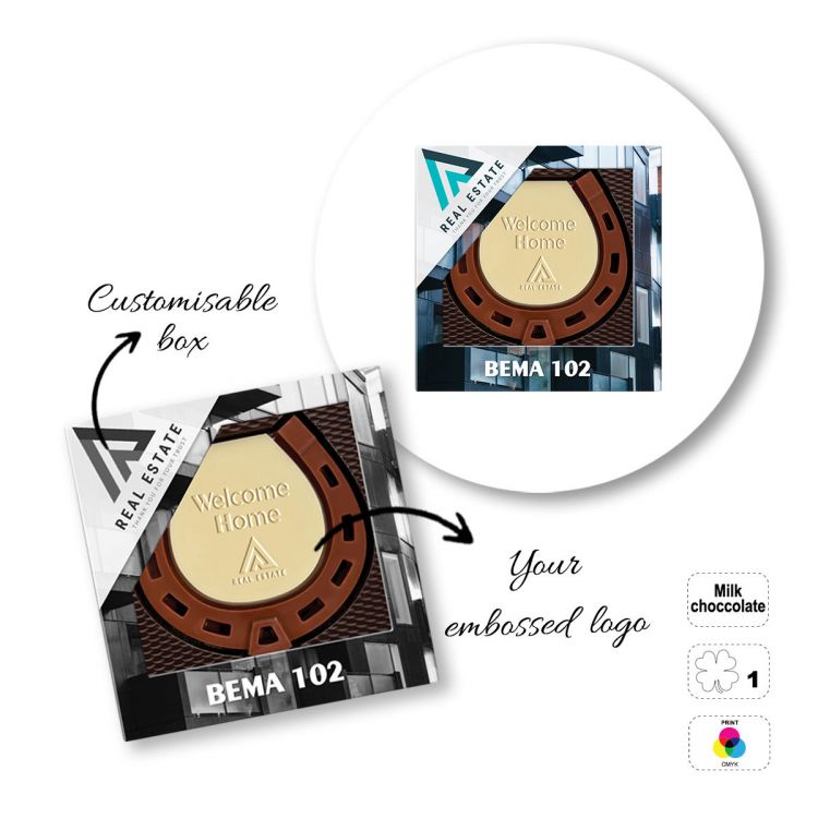 Milk chocolate bar, with different shapes. The letters in the product code correspond to the type of bar: A- four-leaf clover (65 g), B- horseshoe (65 g), C- t-shirt (65 g), D- football (65 g), E- circle (65 g), F- n°1 (65 g). Packaging: fully customizable paper box (paper finish: white or kraft, to be chosen when ordering), pre-formed tray made with rPET. Possibility of embossed customization on the surface of the bar. Minimum shelf life - 8 months.