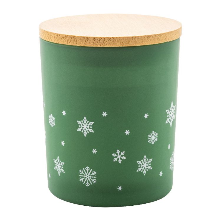 Scented plant-based wax candle in frosted glass holder with Christmas snowflake decoration and bamboo lid. With 120 grams of wax. In kraft paper box.