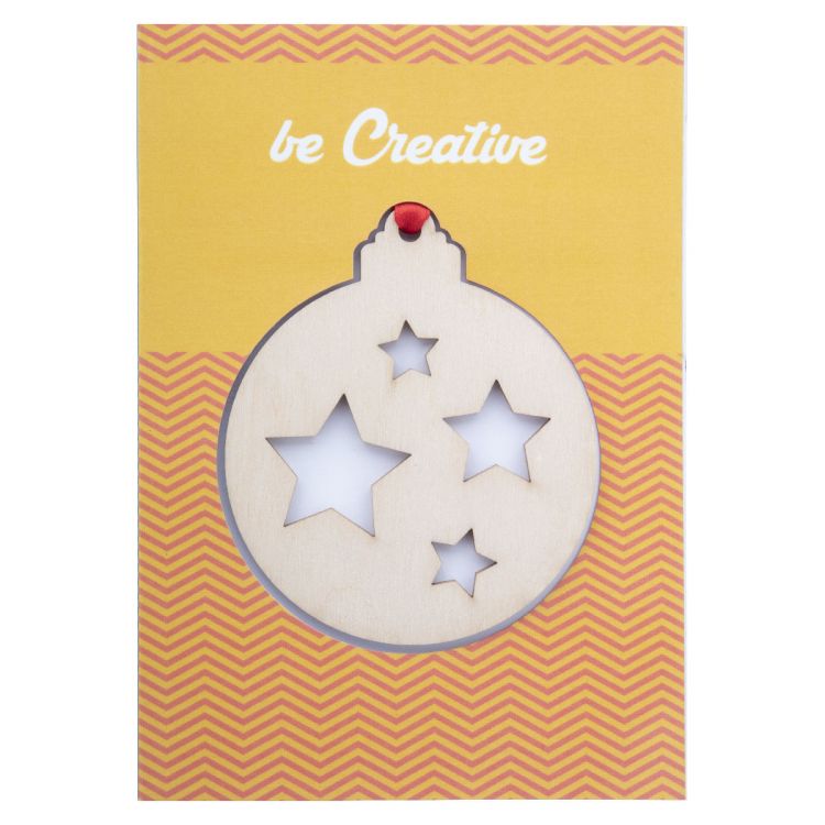 Custom made paper Christmas card with custom graphic on both sides, including wooden Christmas tree ornament with red ribbon. Including C6 postal envelope. MOQ: 100 pcs
