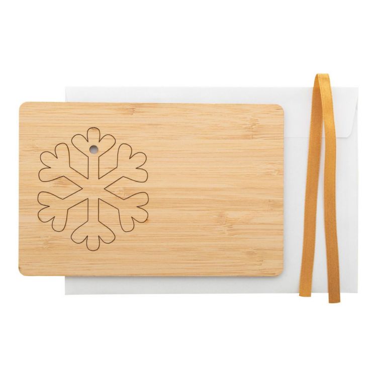 Christmas card in bamboo plywood with break-out Christmas tree ornament with golden ribbon. Including C6 postal envelope. Delivered with detached ribbon