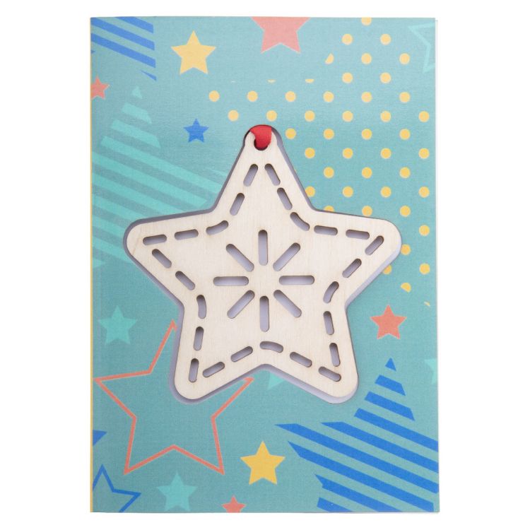 Custom made paper Christmas card with custom graphic on both sides, including wooden Christmas tree ornament with red ribbon. Including C6 postal envelope. MOQ: 100 pcs