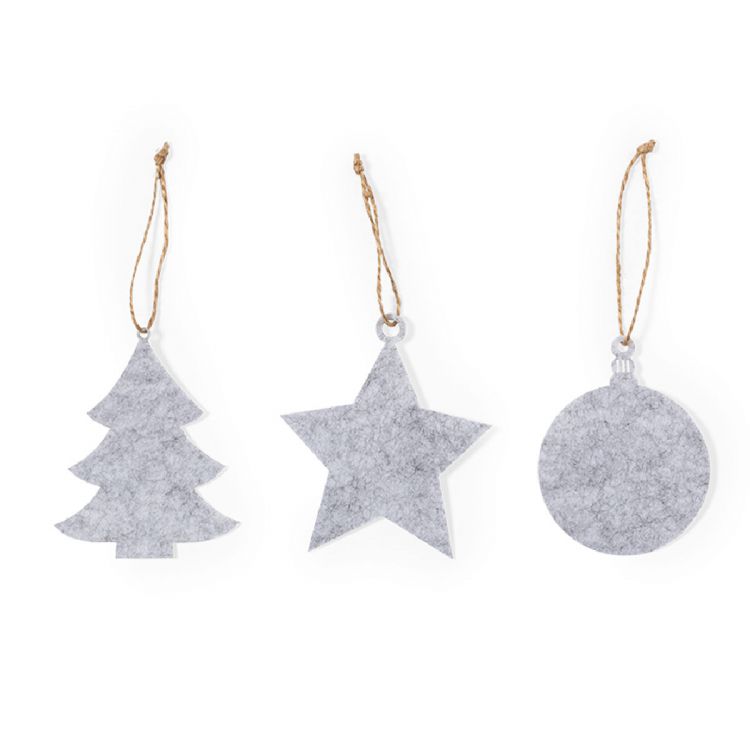 Christmas ornaments set of 3 pieces, made in soft felt. Including 3 designs: Xmas Tree, Star, and Ball. All the ornaments with hanger. Presented in a recycled paper bag. (grey color)