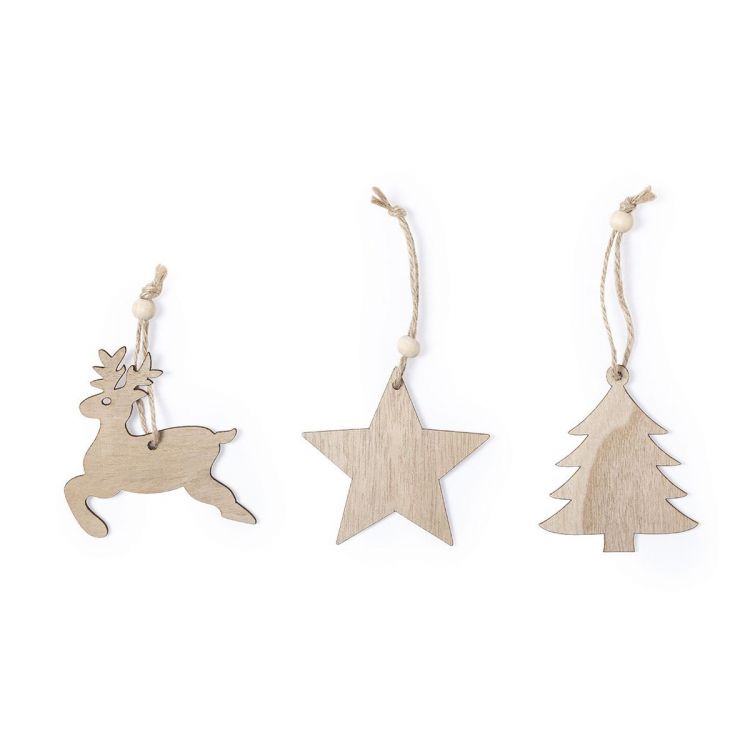 Nature line Set of 3 Christmas figures to hang, made in soft touch wood. Jute string with adjustment accessory. Includes reindeer, star and Christmas tree. Presented in an individual bag, with inner cardboard in natural colour. (neutral color)