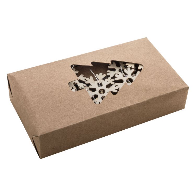 Christmas light string decoration with 20 LED lights in wooden snowflake shape. Operates with 2 AA batteries, without batteries. With ON/OFF button on battery case. In kraft paper box, in neutral color