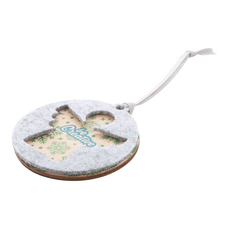Custom made, dual-layer RPET felt and birch plywood Christmas tree ornament with full silver ribbon and die-cut Christmas design on the top layer. Price includes UV LED printing on the bottom layer. MOQ: 100 pcs