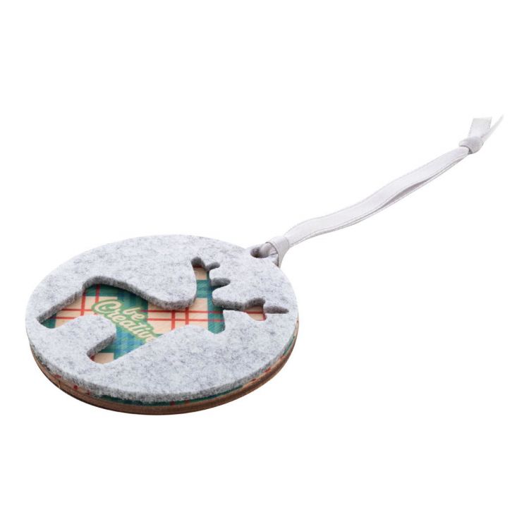 Custom made, dual-layer RPET felt and birch plywood Christmas tree ornament with full silver ribbon and die-cut Christmas design on the top layer. Price includes UV LED printing on the bottom layer. MOQ: 100 pcs