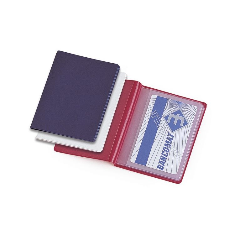 double sided card holder made of leatherette with two inner pockets with side opening for inserting cards. Inside 6 transparent envelopes with side opening welded on the edge.