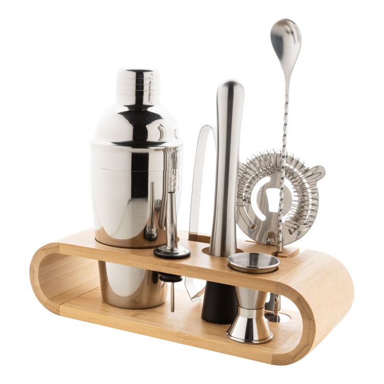 7 pc stainless steel cocktail set in bamboo holder. Including: cocktail shaker (550 ml), jigger, strainer, bar spoon, muddler, ice tongs and a pouring sprout