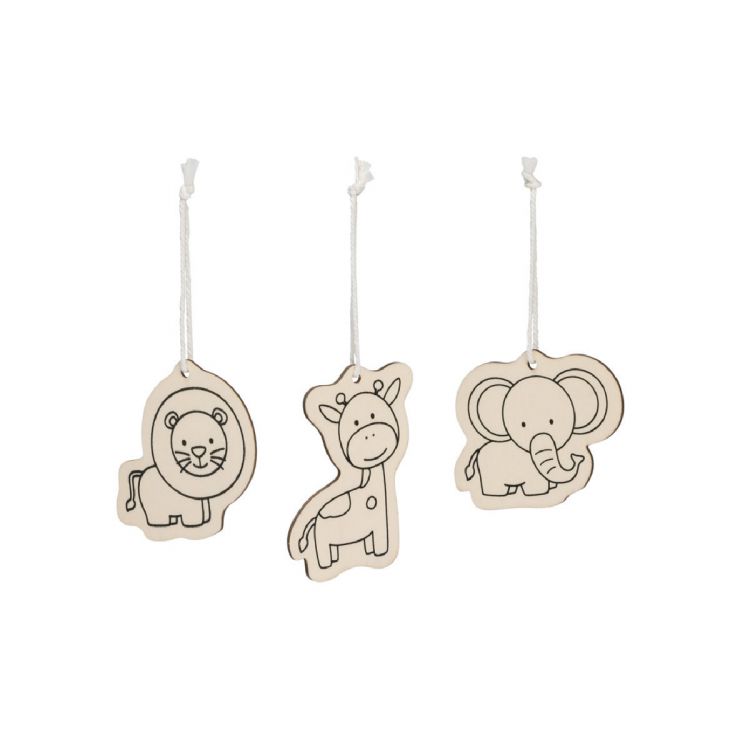 Wooden set for painting. This set contains 3 figures with hanging ribbons and 4 colouring pencils. Supplied in a cadboard box. As the product is made from natural materials, the colour and the printing result may vary between products. Product in neutral color