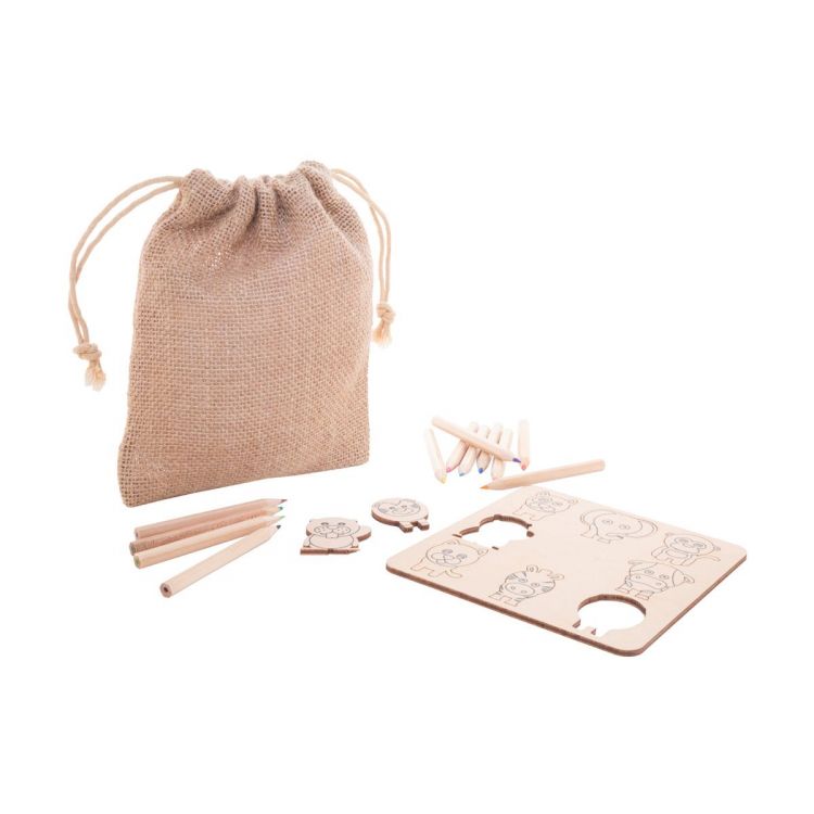 Colouring shape matching game in birch plywood with jute carry pouch. Includes thematic die-cut figures (8 pcs) and wooden coloured pencils (12 pcs) in paper box