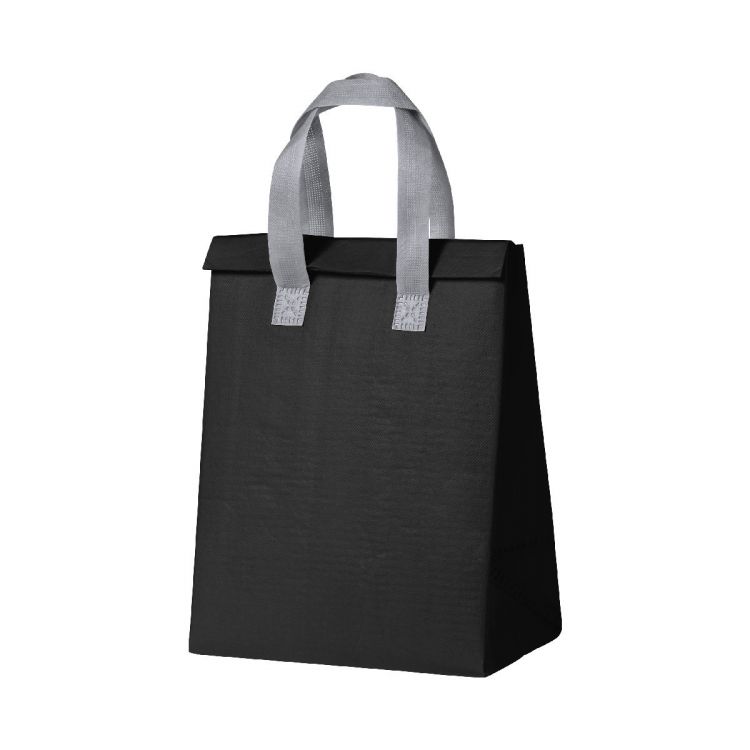 Laminated non-woven cooler bag with handles, velcro closure and aluminium padding, in black color