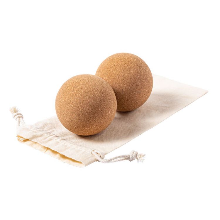 2 pc natural cork massage ball set in cotton pouch. They allow to self-massage and release tension in tight muscles and hard to reach places