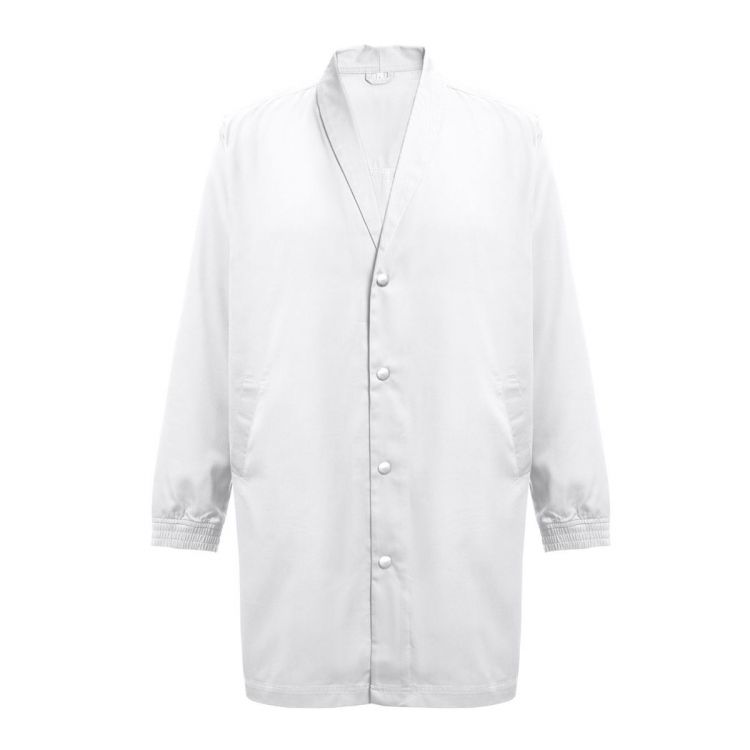 Workwear smock (unisex) 20% cotton and 80% polyester (190 g/m²). Elegant and modern cut with stylised collar and 2 side pockets. Elastic cuffs and buttoning with snap buttons. Opening at the back for greater freedom of movement. Product in white color, size M