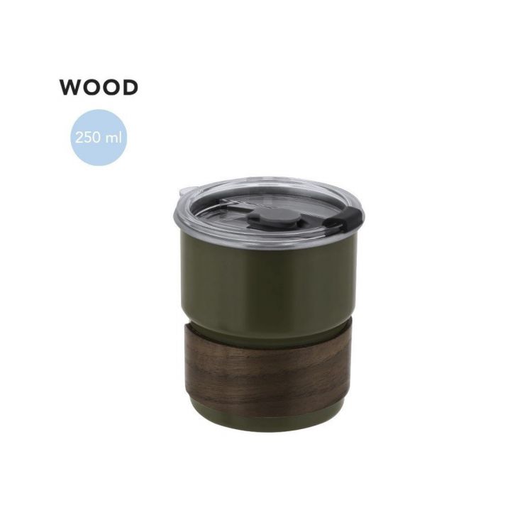 Cup made from stainless steel and sophisticated wood. With a capacity of 250 ml. Includes elegant wooden band. Includes hermetic transparent lid with a dispenser on the lid and a hole for straws, free of BPA.