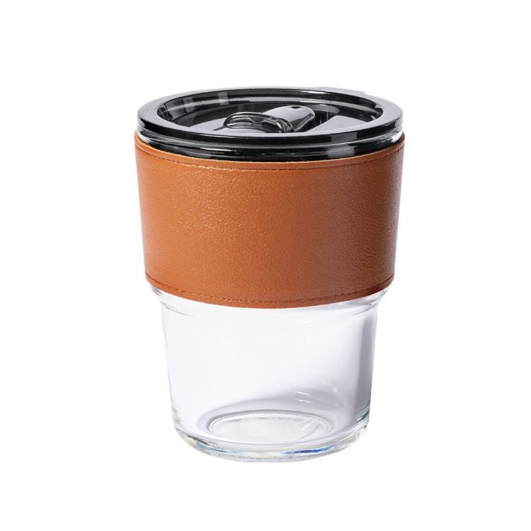 400ml capacity take away design tabletop tumbler, made of a combination of borosilicate glass and leather. It is ideal for your desk, table, or any surface where you can enjoy your favorite drink. The borosilicate glass offers exceptional strength, aesthetics and durability that together with the leather make this glass a sustainable and reusable option, thus reducing the consumption of disposable products. (neutral color)