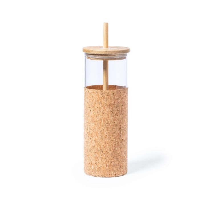 High quality, nature line bottle with a capacity of 500 ml. Body made of borosilicate glass, BPA free, which offers exceptional strength and durability, extending lifespan and able to be reused countless times. Including natural cork sleeve, push-on bamboo lid with straw slot, and reusable bamboo straw. Presented in an individual eco-design box. (neutral color)