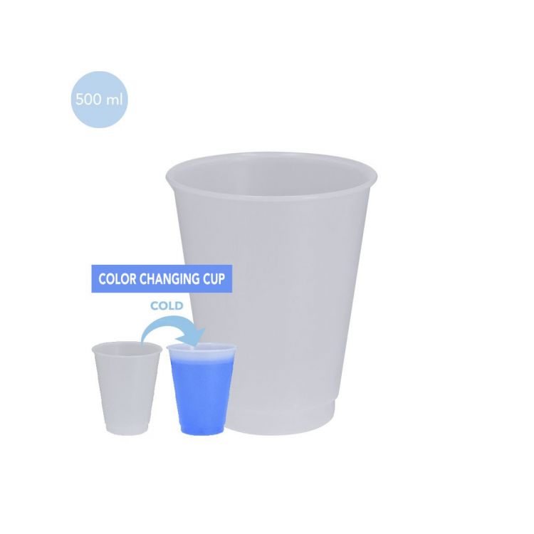 Cup that changes color when in contact with cold beverages. 500 ml capacity. With a frosted translucent finish and made of durable PP material.