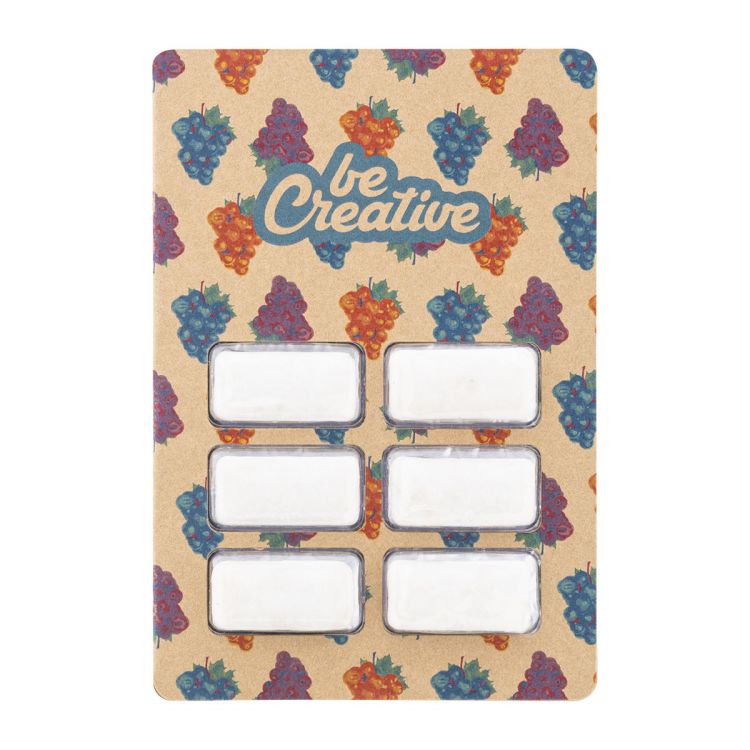 6 pcs sugar free chewing gum in blister with custom made, full colour printed perforated kraft paper sleeve. MOQ: 100 pcs