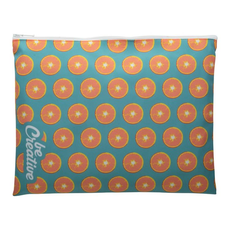 Custom made, zipped document folder in polyester. With all over sublimation printed graphics. A4 size. MOQ: 25 pcs.