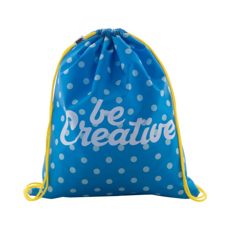 Custom made drawstring bag with coloured strings, 190T RPET polyester. With all over sublimation printed graphics and distinctive RPET label. MOQ: 25 pcs.