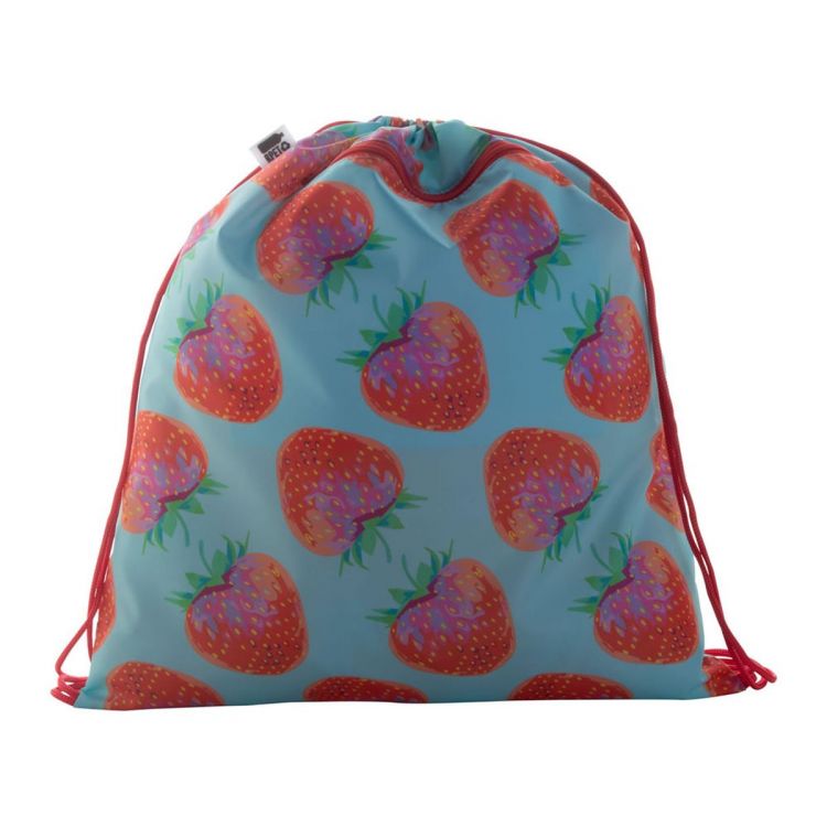 Custom made drawstring bag with zipped front pocket, 190T RPET polyester. With all over sublimation printed graphics and distinctive RPET label. MOQ: 50 pcs.