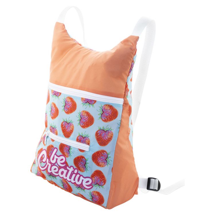 Custom made, foldable RPET backpack with zipped main compartment and zipped front pocket. With all over sublimation printed graphics. 190T RPET polyester with distinctive RPET label. MOQ: 25 pcs.