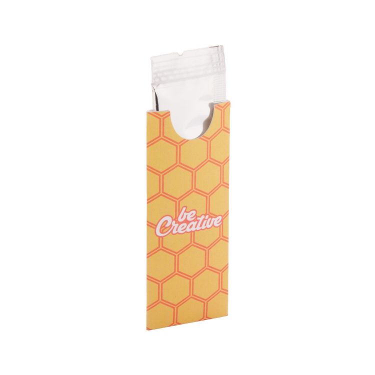 One single serve packet of honey (10 grams) in custom made, full colour printed paper sleeve. MOQ: 100 pcs