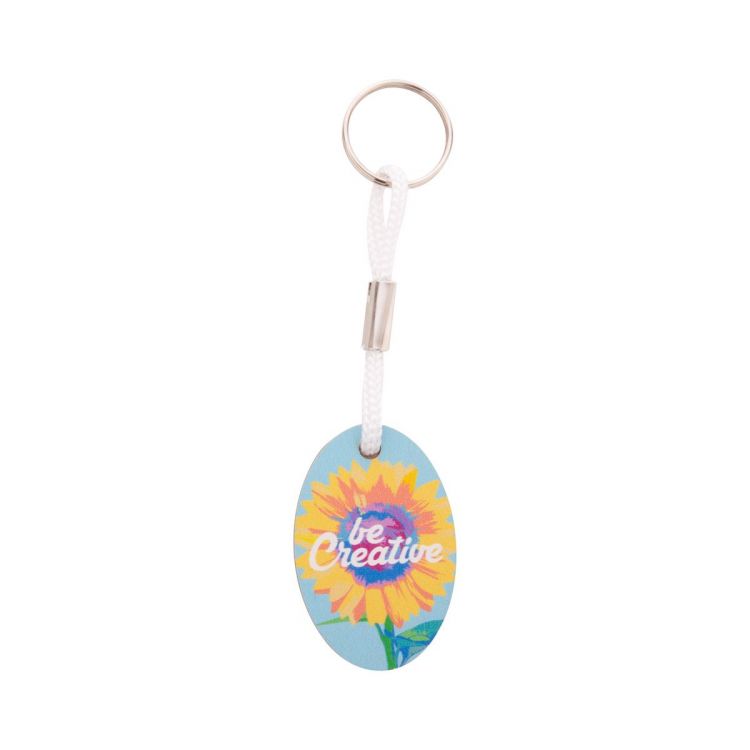 Oval shaped, birch plywood keyring with coloured polyester string and full colour printing. Price includes UV LED printing on one side. MOQ: 200 pcs.