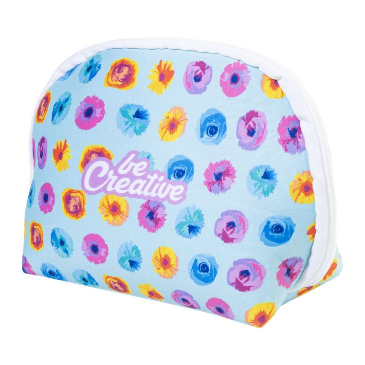 Custom made, zipped cosmetic bag in RPET neoprene. With distinctive RPET label and all over sublimation printed graphics. MOQ: 50 pcs.