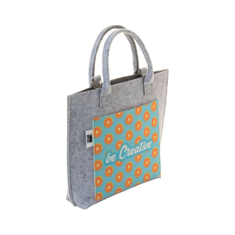 Custom made, RPET felt ladies crossbody bag with full colour printed front pocket. With short handles, detachable shoulder strap and distinctive RPET label. Price includes sublimation printing. MOQ: 25 pcs