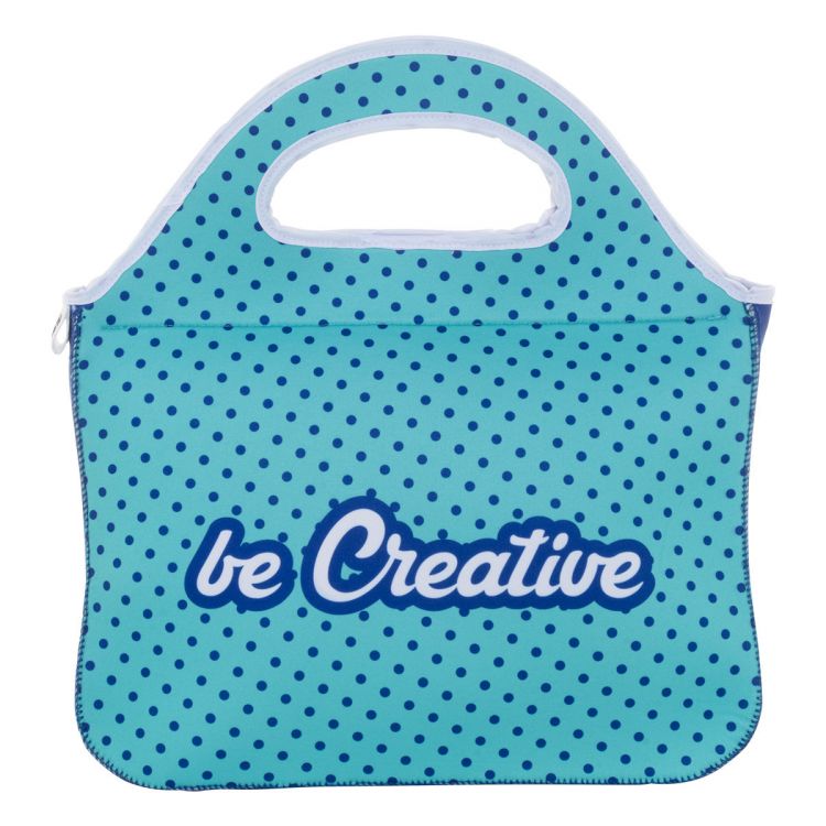 Custom made, RPET neoprene lunch bag with zipped compartment and handles. With all over sublimation printed graphics and distinctive RPET label. MOQ: 25 pcs