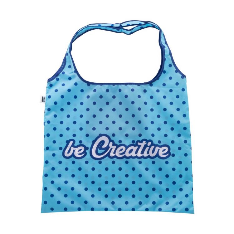 Custom made, foldable shopping bag in 190T RPET polyester. With all over sublimation printed graphics and distinctive RPET label. MOQ: 25 pcs