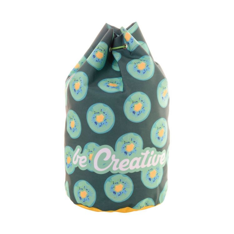 Custom made, drawstring sailor bag in 600D RPET polyester, with coloured strings. With all over sublimation printed graphics and distinctive RPET label. MOQ: 25 pcs.