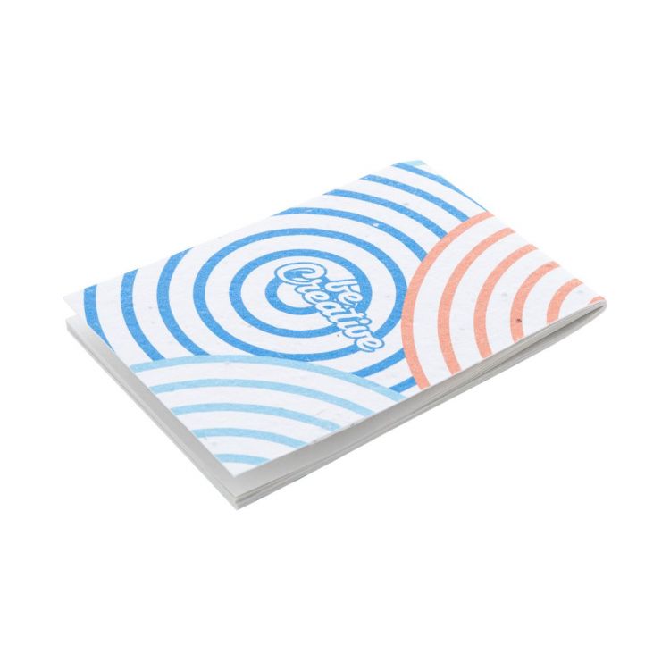 Custom made, seed paper covered mini notebook with 32 recycled paper sheets, A7 size. Price includes full colour printed outside cover. MOQ: 100 pcs. With assorted wildflower seeds