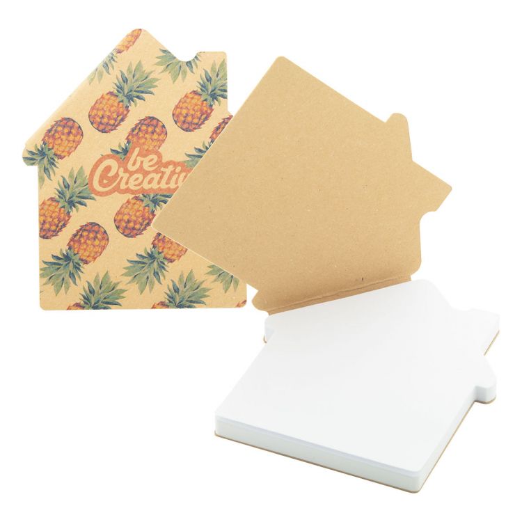 Custom made, recycled kraft paper covered house shaped sticky notepad. Includes 50 sheets of recycled paper sticky notes. Price includes full colour printed outside cover. MOQ: 100 pcs