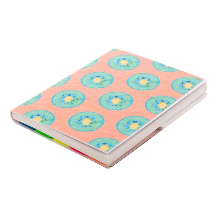 Custom made, seed paper covered sticky notepad. Includes recycled paper sticky notes in 2 sizes (50 sheets of 100×75 mm, 25 sheets of 50×75 mm) and 100 plastic film page markers in 5 assorted colours (12×44 mm). Price includes full colour printed outside cover. MOQ: 100 pcs. With assorted wildflower seeds