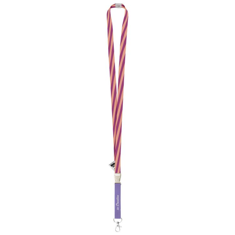 Custom made, 15 mm wide RPET lanyard with detachable metal carabiner and wheat straw plastic safety buckle. With sublimation printed graphics on both sides. MOQ: 100 pcs
