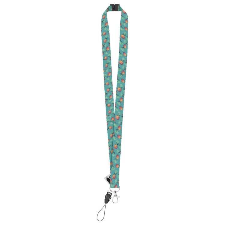Custom made, RPET lanyard with metal carabiner, mobile string and safety buckle. With sublimation printed graphics on both sides. MOQ: 100 pcs