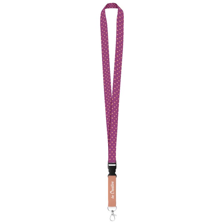 Custom made, polyester lanyard with detachable metal carabiner. With sublimation printed graphics on both sides. MOQ: 100 pcs