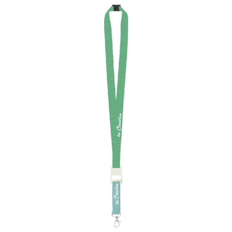 Custom made, polyester lanyard with metal carabiner, bottle opener and safety buckle. With sublimation printed graphics on both sides. MOQ: 100 pcs