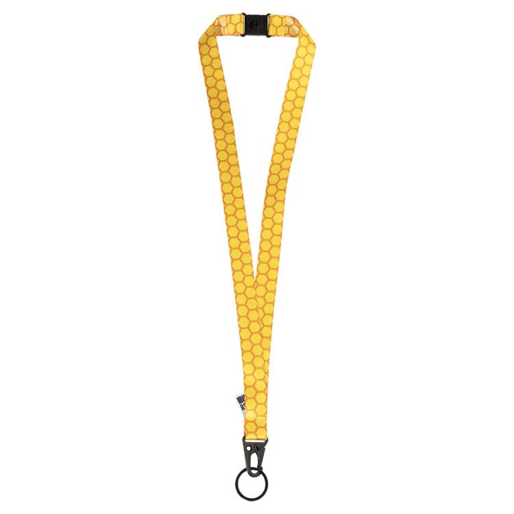 Custom made, RPET lanyard with black metal tactical style snap hook carabiner, keyring and safety buckle. With sublimation printed graphics on both sides. MOQ: 100 pcs, in black color