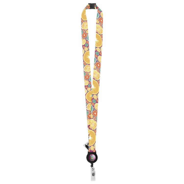 Custom made, RPET lanyard with telescopic badge holder and safety buckle. With sublimation printed graphics on both sides. MOQ: 100 pcs