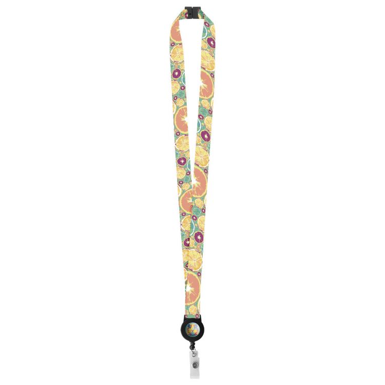 Custom made, polyester lanyard with telescopic badge holder and safety buckle. With sublimation printed graphics on both sides. MOQ: 100 pcs