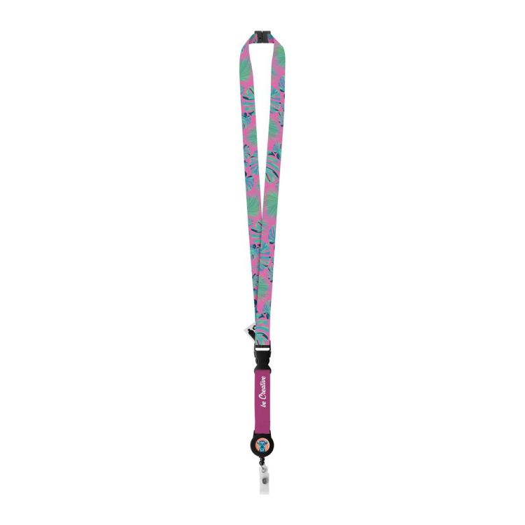 Custom made, RPET lanyard with detachable telescopic badge holder and safety buckle. With sublimation printed graphics on both sides. MOQ: 100 pcs