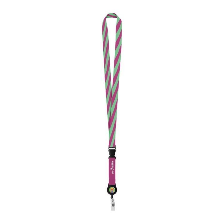 Custom made, wide polyester lanyard with detachable telescopic badge holder. With sublimation printed graphics on both sides. MOQ: 100 pcs
