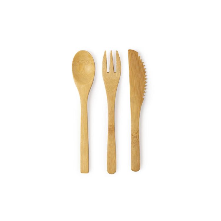 Set of cutlery in nature line. Made of bamboo, including fork, spoon and knife. Presented in a cotton pouch with self-closing strings. (neutral color)
