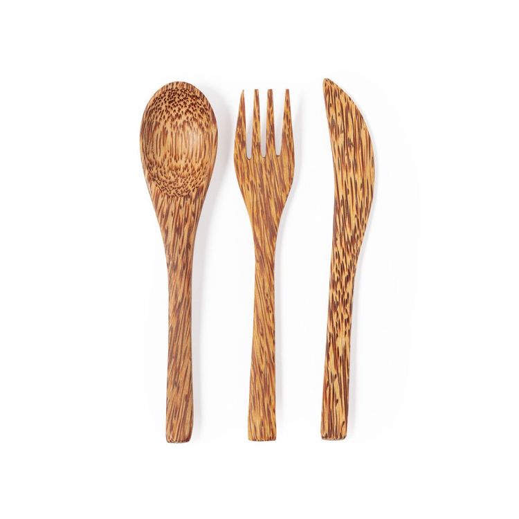 Nature line, reusable cutlery set made from coconut. After consuming the coconut fruit, a whole range of products can be obtained from the coconut and its plant, contributing to the sustainability of the planet and encouraging the use of natural raw materials. Including spoon, knife and fork. Presented in an individual cotton bag with drawstring closure. (neutral color)