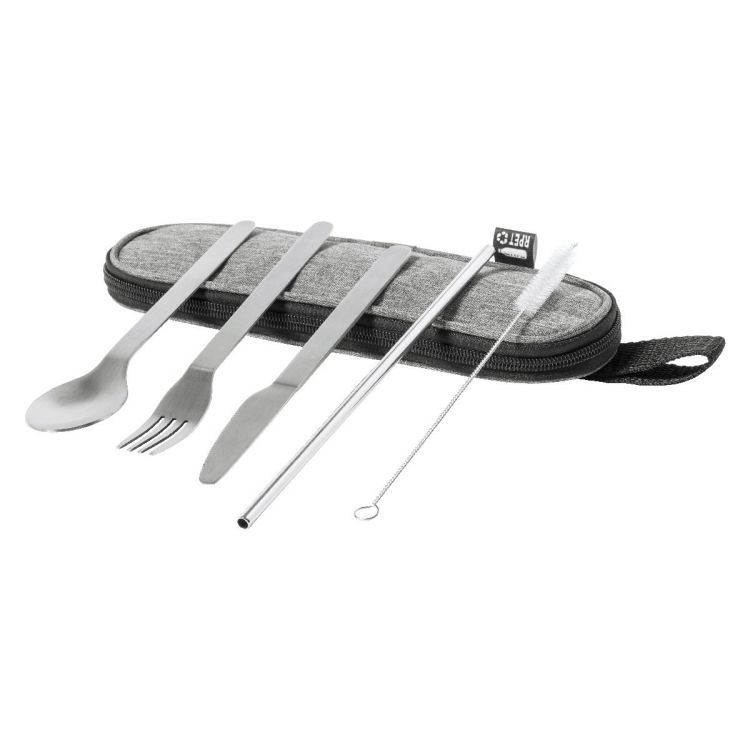 5 pc stainless steel cutlery set in RPET polyester pouch. Including fork, knife, spoon, drinking straw and cleaning brush