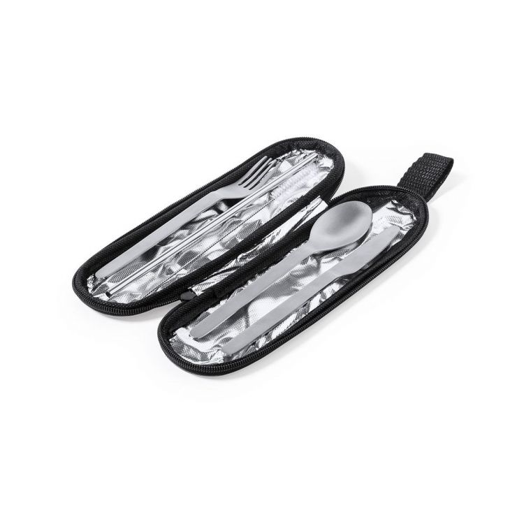 Reusable cutlery set made of strong and durable stainless steel. Including spoon, knife, fork, straw and cleaning accessory. Presented in an elegant, individual 300D RPET polyester case made from recycled plastic, to encourage the reuse of plastic waste and help the sustainability of the planet. Presented inside an individual case with carrying strap, zip closure and RPET emblem on outside label. (neutral color)