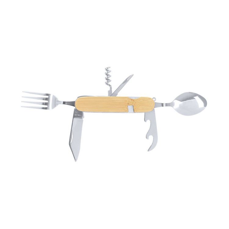 Multifunctional cutlery set made of stainless steel and bamboo. Includes 7 functions: spoon, fork, knife, bottle opener, can opener, corkscrew, and awl.Materials like bamboo promote the use of natural raw materials, reducing pollutant emissions. Additionally, bamboo comes from a resilient and versatile plant, with fast growth and regeneration, making it an excellent alternative to traditional wood. (neutral color)